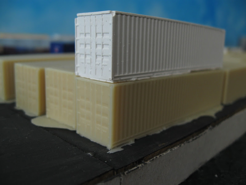 De containers breng ik op kleur met de airbrush. Voor de verf gebruik ik Revell aqua color. Ik wil verder nog een paar meer verschillende kleuren containers gaan maken.