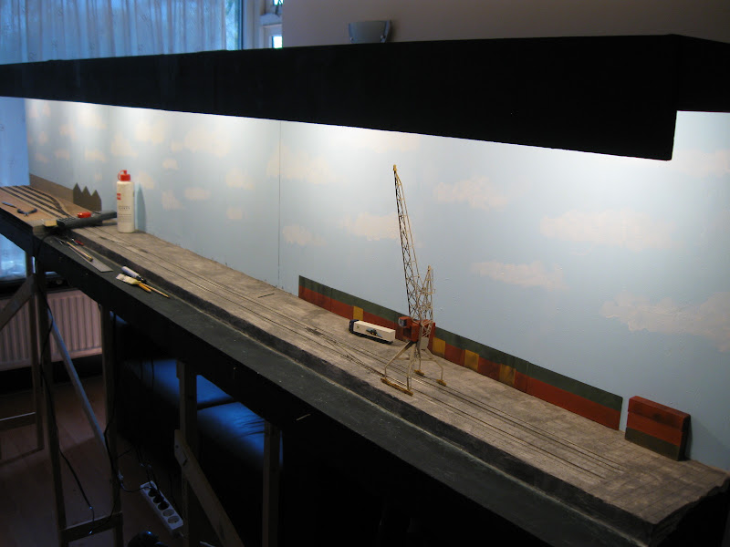 Ik heb nu ook een poging gedaan voor het maken van de wolkenlucht op de achtergrond van de modelbaan. Verder heeft de rails een roest kleurtje gekregen. En heeft de kade de eerste opvulling met gips gekregen.